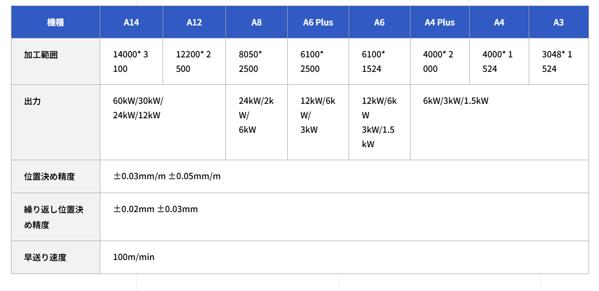 ・3048㎜×1524㎜から14000㎜×3100㎜までの加工範囲があります