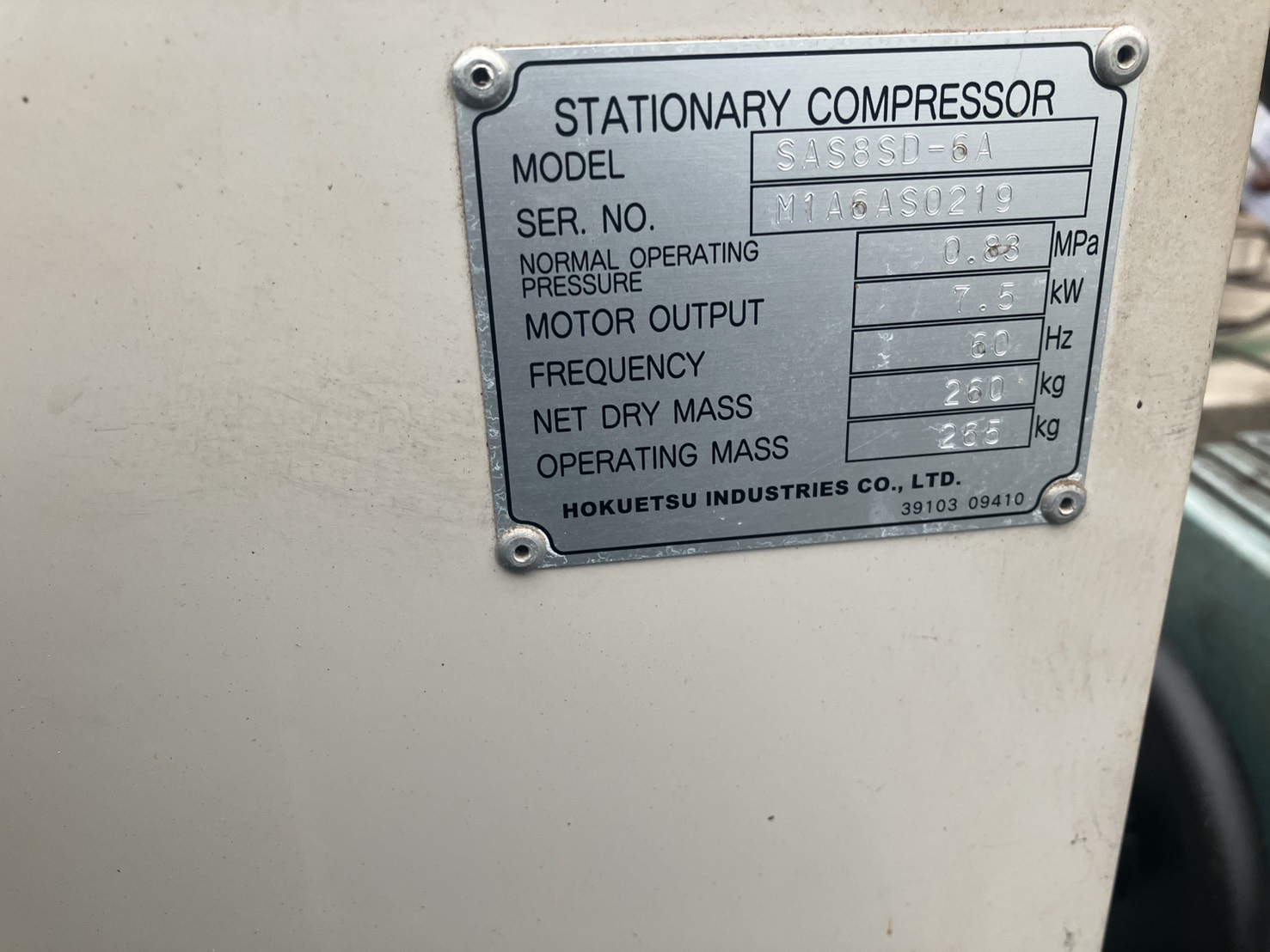 コンプレッサー 北越 SAS8SD-6A 2011年